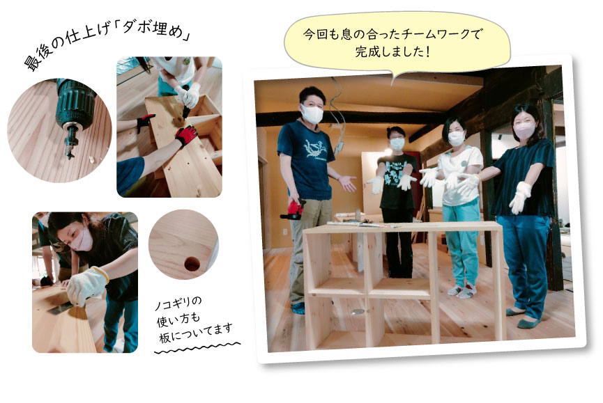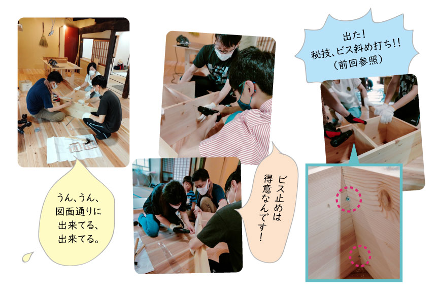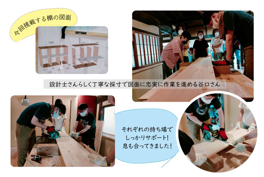 一つ目の棚を完成させたのが一か月前、なかなか勘を取り戻すのに時間がかかりそうでしたが、谷口さんの小学校の先生のような優しい指導で、迷える生徒たちを導いてくれます。
