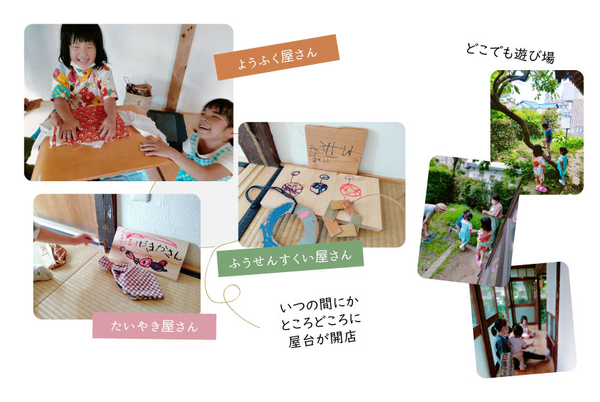 「カキゴオリやさん」の看板を作ってたと思たら、他の和室のあちこちにも屋台の看板が…。布でできた鯛焼きを売る「たいやきやさん」に段ボールの「ふうせんすくいやさん」、おしゃまな店員のいる「ようふくやさん」も。