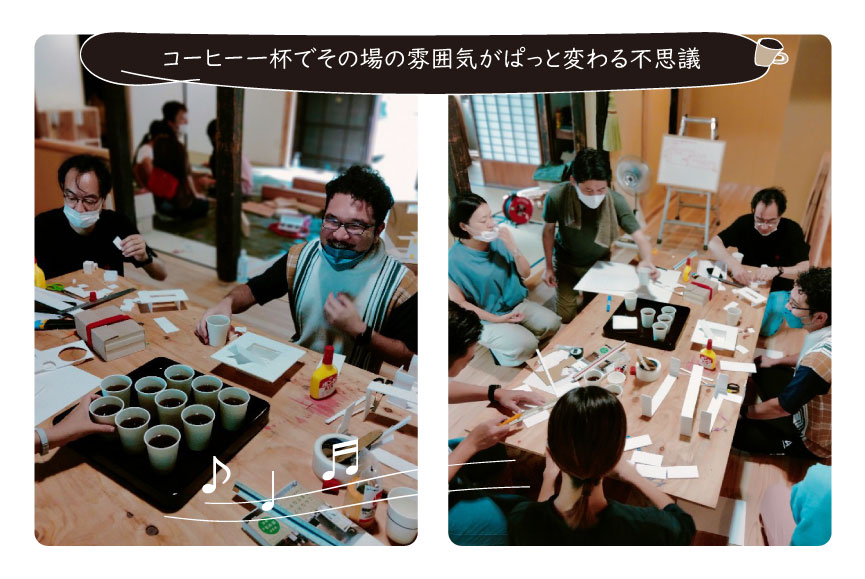 もうすっかりワークショップのレギュラーメンバーとなった山本さん※が「少しリラックスして心を遊ばせましょう」と持参いただいたお手製コーヒーをみんなにふるまってくれました。しかもセンスの良いご夫婦選曲のBGM付き。