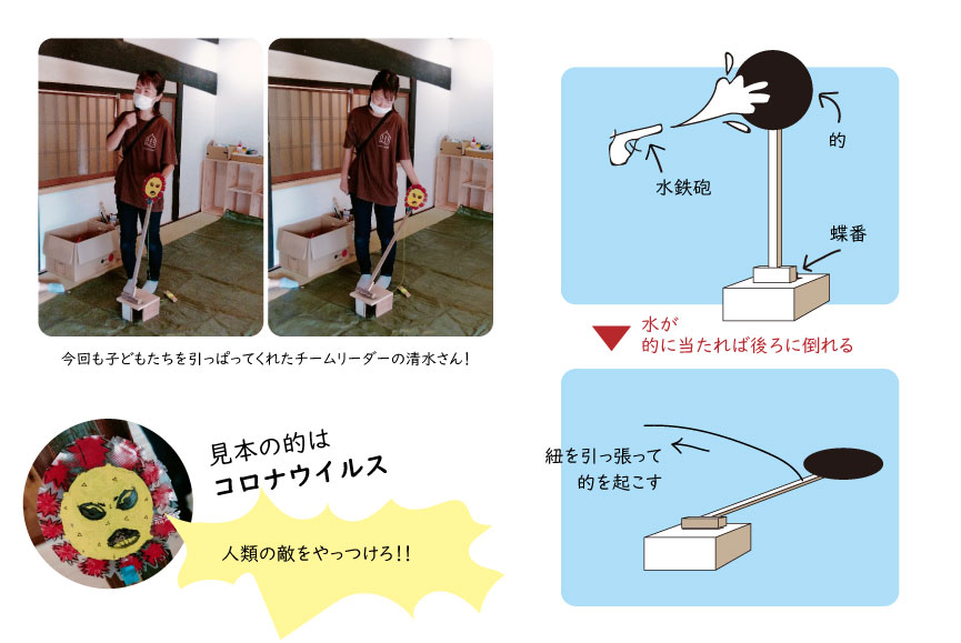 水鉄砲で的のついた木の棒を倒すという木工遊具です。
