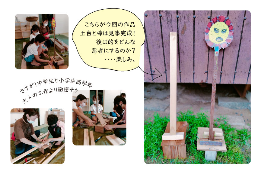 地域の方が作ってくれた手作りの的当て。それを真似て的当てづくり。