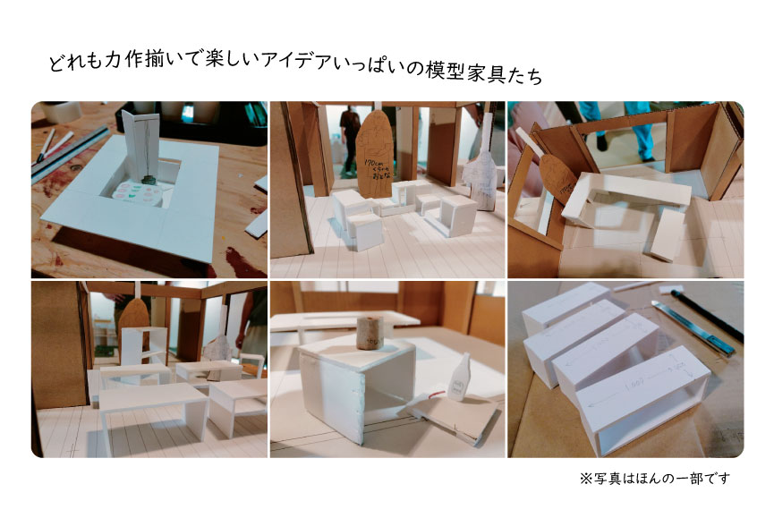 「考えた家具は建築模型に使うスチレンボードを切り貼りし10分の1の模型にします。後で間取りの模型に置いてどのように使う家具なのか発表してください」