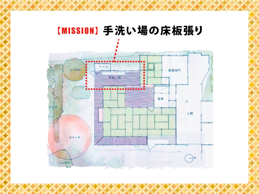 この古民家は「四つ間取り」といわれる伝統的な農家のつくりだそうで、中央の四つの居間の三方をぐるりと囲む縁側が特徴的。今回はその西の縁側の床板張りに挑戦です。