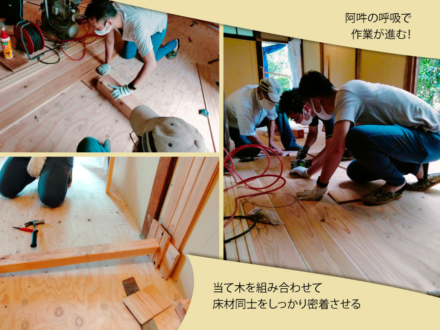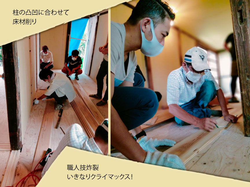 当て木を巧みに組み合わせ叩き込んでしっかり密着させる梅さんの技に全員感心。あとはフロア釘で固定しその勢いのまま3枚目に!