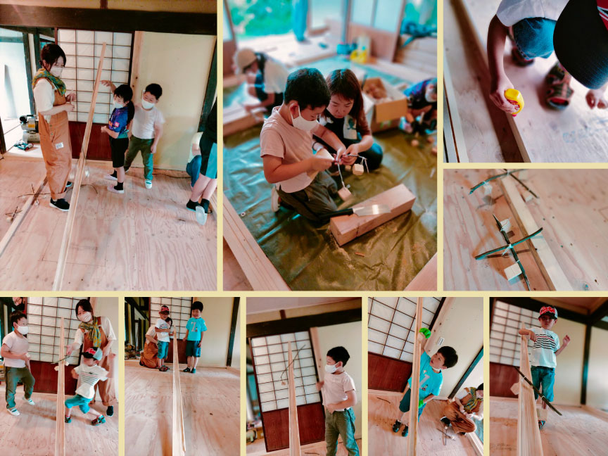 建築の専門家が調査したところ、明治後期以前に建てられた四つ間取りというタイプの伝統的な農家であることが分かり、構造補強工事をすれば使用できることが判明しました。そこで広島市の「元気なまちづくりプロジェクト地域活動支援事業」を利用して耐震補強工事を行い、今年の5月から地域の住民を交えた活動を始めています。主な活動内容は二つあり、ひとつは補助事業で構造補強工事しかできなかった家屋において、壁や床といった利用者が直接触れる部分の工事を、プロジェクトに賛同する市民の力によってDIYで仕上げていくもので、近隣の大工経験者や建築家の助けを得ながら、みんなで一緒に行っています。もうひとつは、仕上がった日本家屋で工作のワークショップといった子どもたちと大人が一緒に楽しみながら交流できる活動で、近隣の認定こども園くすの木の保育士たちが主体となってすすめています。