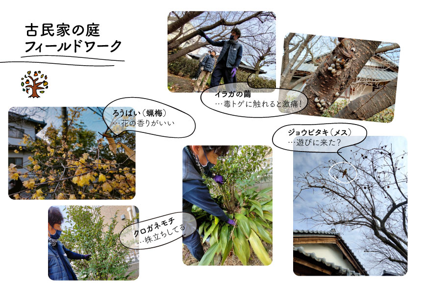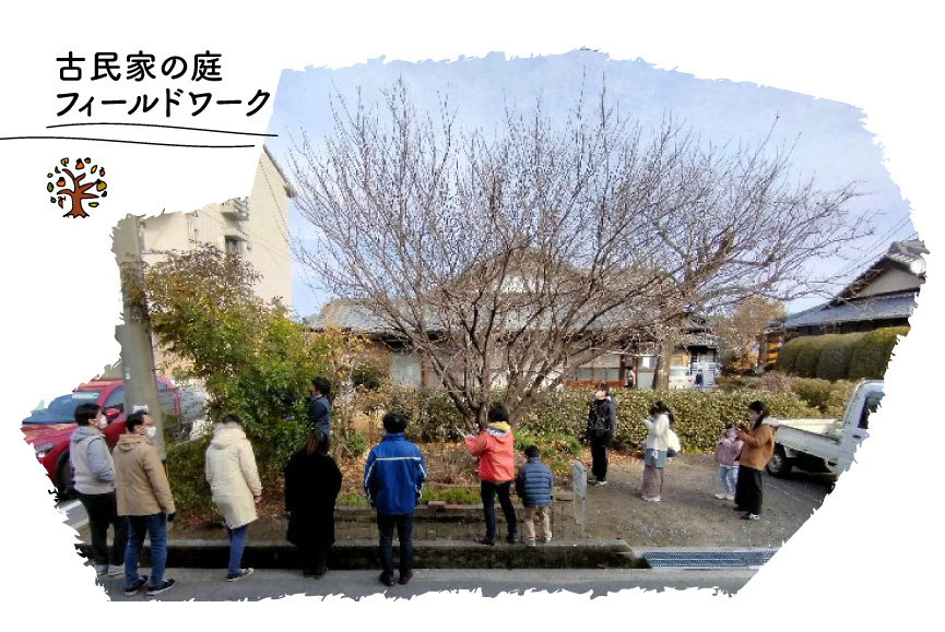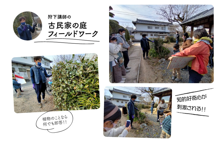 日本に十数人しかいない苗字という狩下さんを講師に、古民家の庭のフィールドワーク開始です。