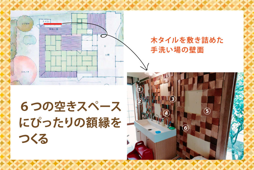 洗面所の木タイルの壁面の空白部分に、子どもたちの絵や作品を飾るための額縁を制作。