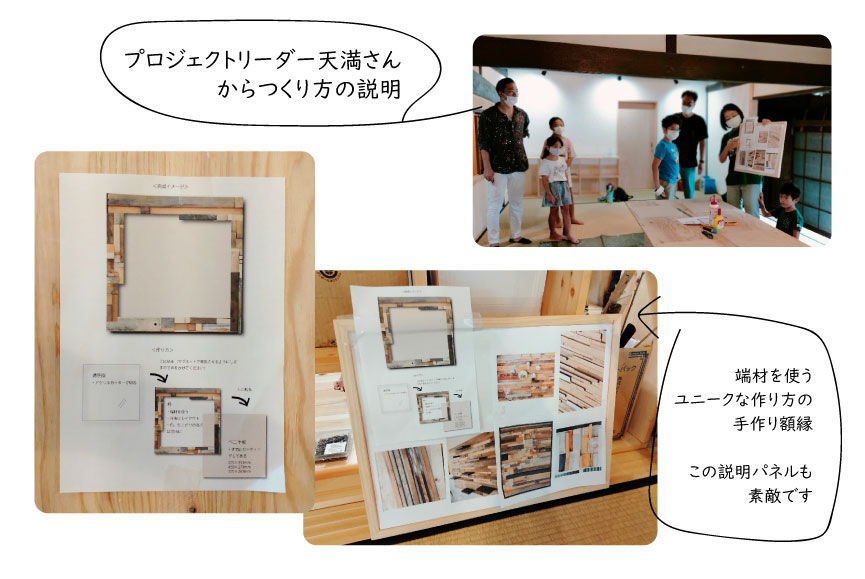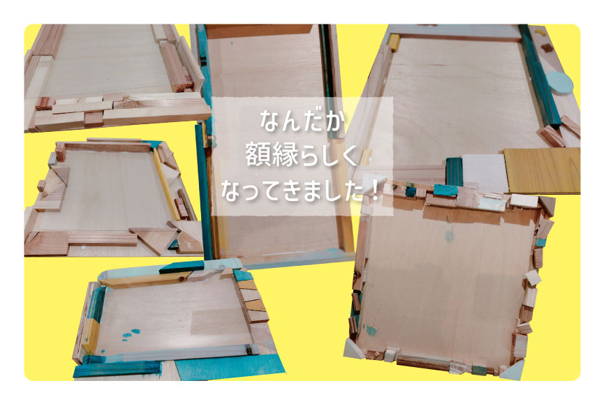 ここでも天満さんらしく、作るのは普通の額縁ではありません。これまで床や棚づくりで出た木材の端材を使ったお洒落でユニークな額縁を考えていました。