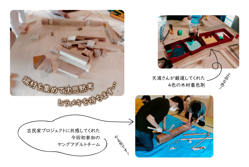 「制約は現在ある端材を使うことと、着色する場合は準備した4色のステイン(木材着色剤)を使うこと、それだけ。あとは自由なアイデアで作ってください」と天満さん。