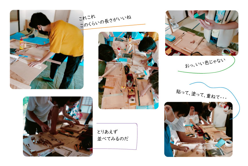 しばらく端材を前に皆さんう~んと唸っていましたが、思いついた順に切ったり貼ったり塗ったりと、みんなそれぞれ作業に取り掛かり始めました!