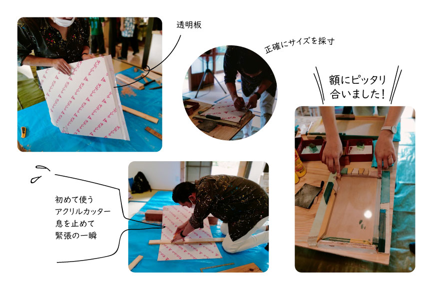 そしていよいよ額づくりの最終段階、額縁のサイズに合わせて透明板を専用のアクリルカッターで切断します。割れて欠けやすいので慎重に進めます。