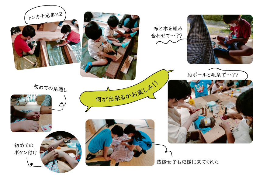 すぐに材料と道具を選んで、あっちでトントン(釘打ち)、こっちでサクサク(布断裁)、
